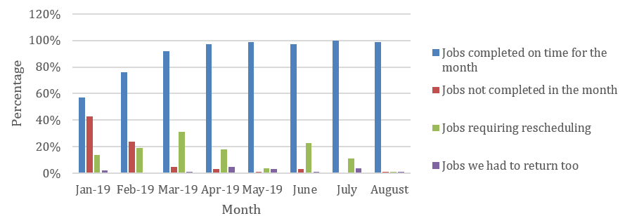 It appears the media is intent on spreading fear and pessimism throughout the business sector. Dutton Stormwater does not subscribe to opinions of the media. Our perception of business in New Zealand and what we are doing remains positive and strong. We defy the odds and have done since our inception. We as a company are not affected by media or other perceptions. We are focusing on our tasks. This is illustrated by the graph below which shows how our percentage of jobs completed being very close to 100% since April.